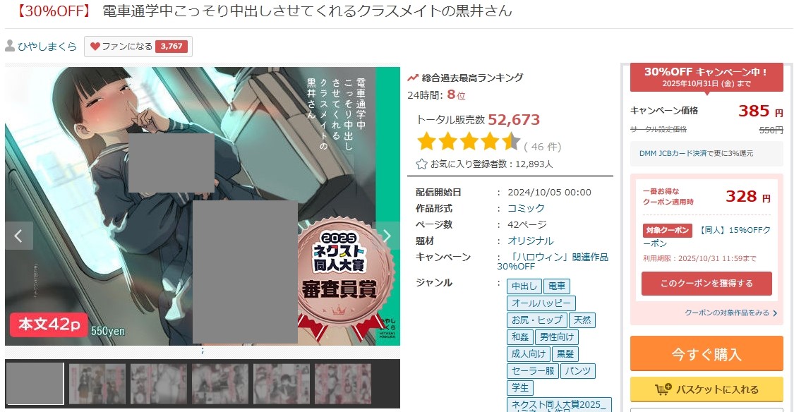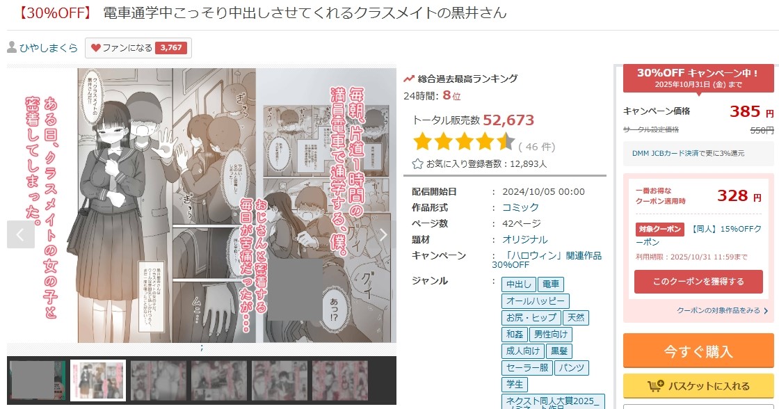 『電車通学中こっそり中出しさせてくれるクラスメイトの黒井さん』もDLsite限定で、クーポン適用後275円で購入可能です。