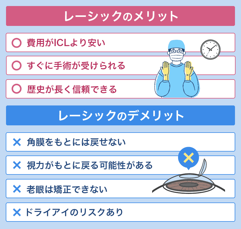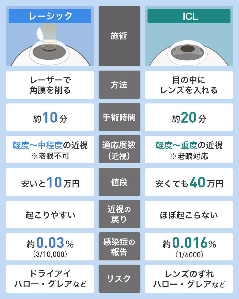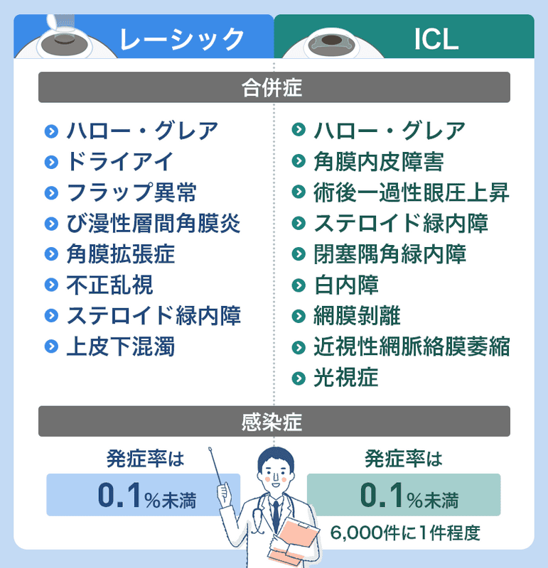 レーシックとICLには、どちらも合併症や感染症のリスクがあります。