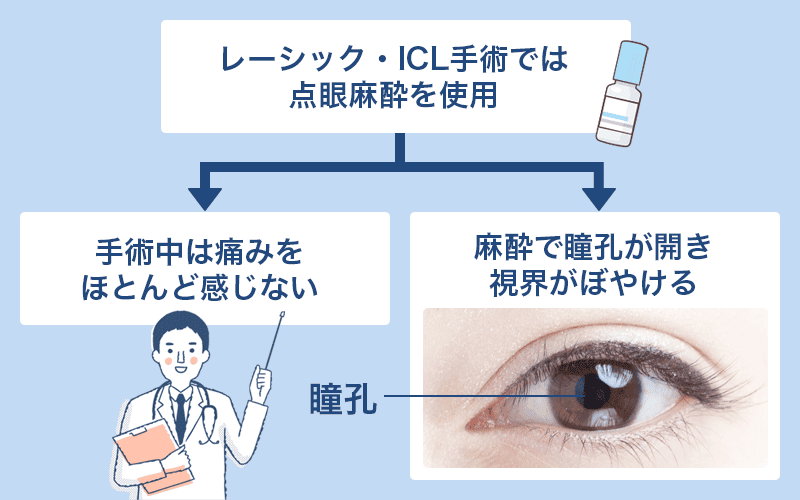 レーシックとICLの手術では点眼麻酔(目薬タイプの麻酔)を使用するため、手術中に強い痛みを感じることは基本的にありません。