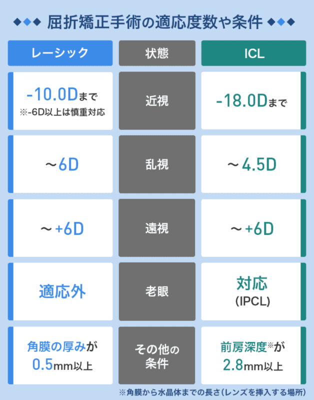レーシックとICLはそれぞれ、目の状態や視力によって手術が受けられないケースがあります。