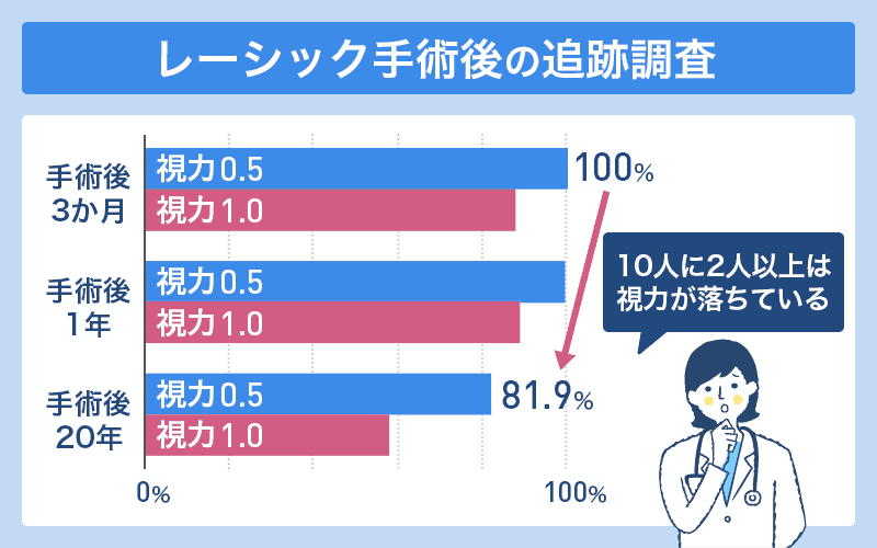 手術後3か月の時点の視力は全員が0.5以上(8割は1.0以上)でしたが、20年後に0.5の視力を維持できていたのは対象者の81.9%でした。