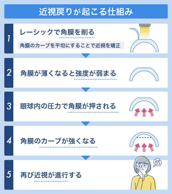 レーシックで削られた角膜は強度が弱く、眼球内の圧力で湾曲しやすいため、近視が再び進行することがあるのです。