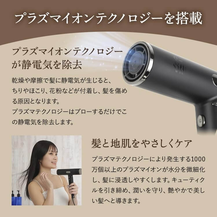 ブラシレスDCモーター搭載で耐久性も高く、プラズマイオンケアにより髪のダメージを抑えツヤを与えます。