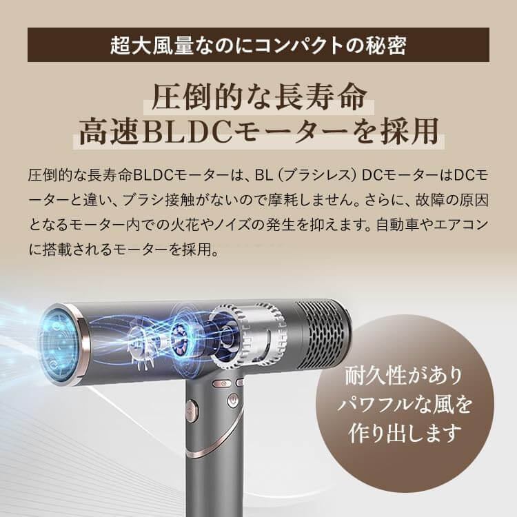 高速BLDCモーターによるパワフルな大風量と速乾性が特徴です。