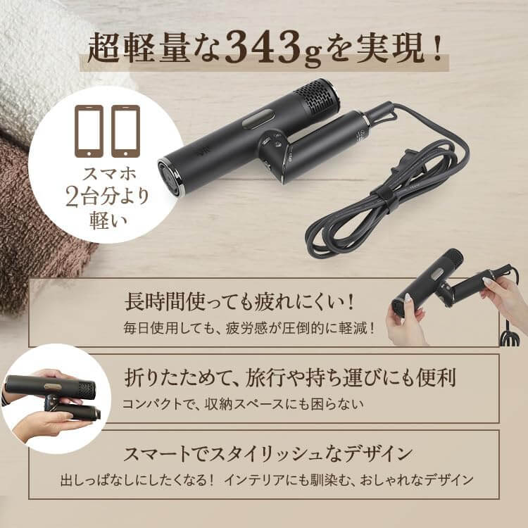 87saku ヘアドライヤーは高性能でありながら、343gと超軽量でコンパクトです。