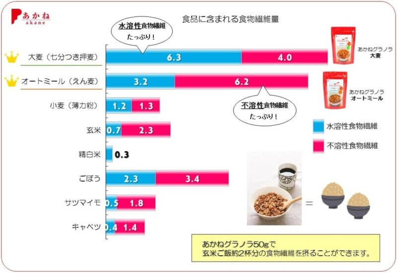 あかねグラノラ ロングライフは、主原料に大麦またはオートミールを使用し、食物繊維がたっぷり。