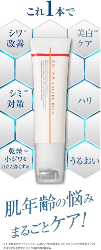 アンテアローラーリッチの最大の魅力の一つが、厚生労働省認可のシワ改善成分「ナイアシンアミド」を高濃度で配合している点。