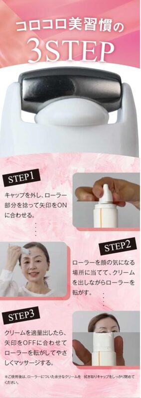 特殊構造のローラーでシワ・美白に効くクりームをシワに直塗りできる構造。