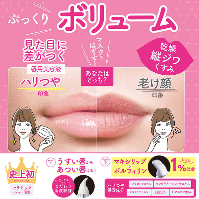 高配合されたマキシリップが唇表面の縦ジワを目立たなくし、ボルフィリンの力でぷっくりとした弾力のある唇に。