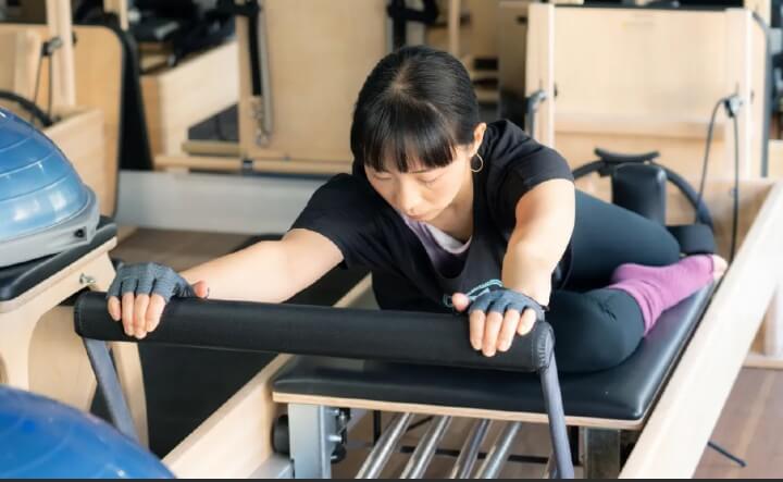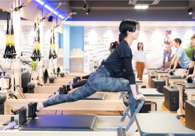 CLUB PILATESでは、リフォーマーをはじめとする専用マシンを使い、床では難しい動きを安全かつ効率的に行います。