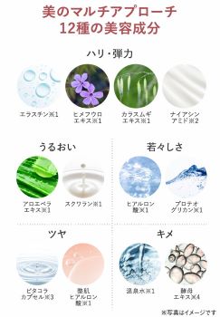 コラリッチEXはハリと弾力を与えるエラスチン※、キメを整える温泉水※、若々しさに大切なプロテオグリカン※など12種類の注目の美容成分が配合されています。