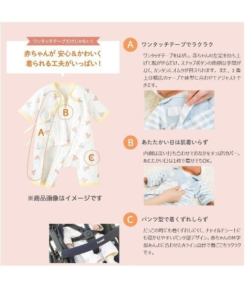 コンビミニのラップクラッチは前開き「ワンタッチテープ」による着脱が容易なロンパース型カバーオール。