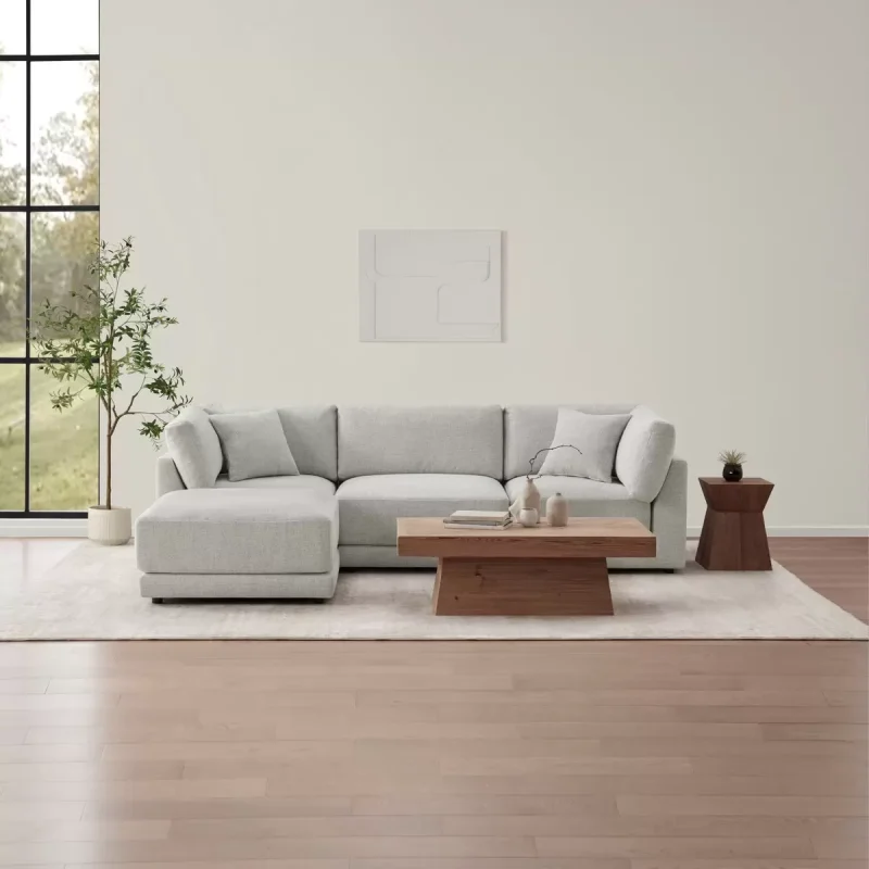スポンジとシルクのパッドで柔らかく快適な座り心地を実現した、Haze Nest ファブリックコーナーソファ。