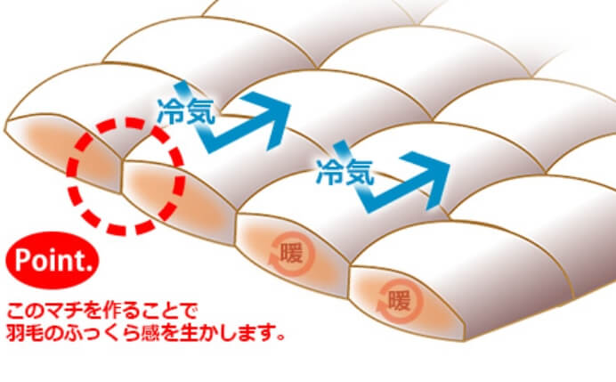 小部屋を作ることで、布団全体に羽毛がいきわたるので、保温効果が高まります。