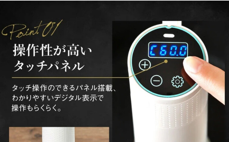 設定温度までの時間が短縮され、例えば、6Lの水を60℃にするのにかかる時間は約10分。8Lなら15分、10Lでも20分程度と、家庭用低温調理器の中でも圧倒的な速さ。
