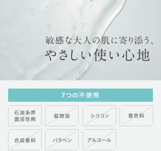 石油系界面活性剤・鉱物油・シリコンなど7つの無添加でパッチテスト・アレルギーテスト済みです。(※すべての方に刺激がないわけではありません)