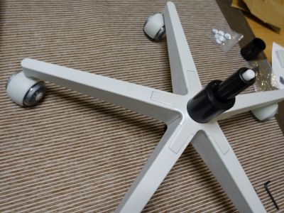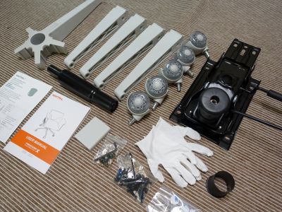組み立てはシンプル。アームレスト、背もたれ、キャスター部分の順に組み立て設置するだけで完了しました!