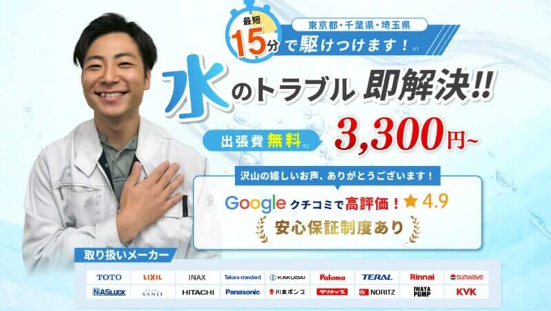 FUJISUI(フジスイ)は、関東地域を対象に24時間365日いつでも駆けつけ可能で、最短15分というスピード対応が魅力。