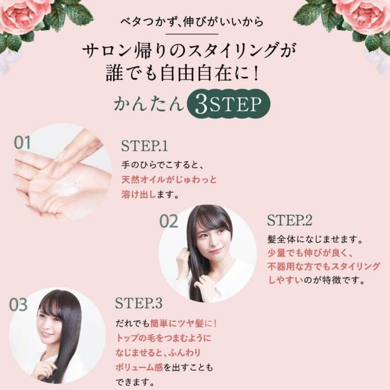 ハンドクリームにもなるので、髪につけた後に手を洗わずにそのまま手の保湿もできるのが楽だし便利です。
