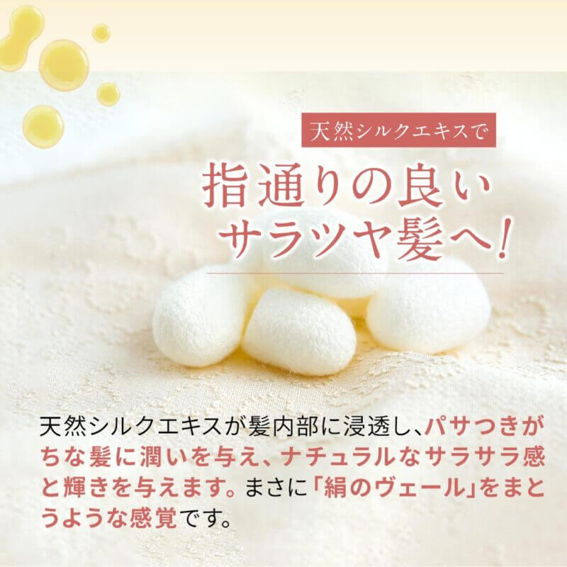 天然シルクエキスは髪内部まで浸透し、ダメージを受けてパサつきが気になる髪を保湿。