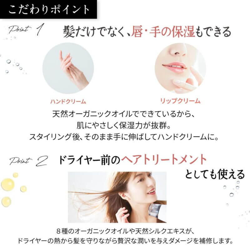 髪をスタイリングしたあと、そのまま手や唇につけるだけで保湿ができる優れものです。