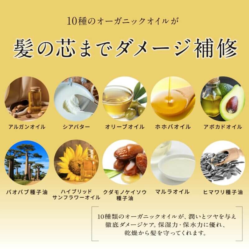 アルガンオイルやシアバター、ホホバオイルなど多数のオーガニックオイルが髪をケアして、うるおいやツヤを与えてくれます。