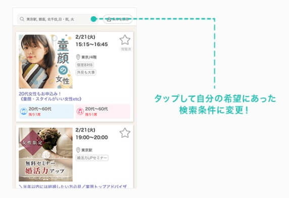 エリア・年齢・職業・趣味などの条件を設定して、自分に合う婚活・恋活パーティーを検索し、申し込みます。