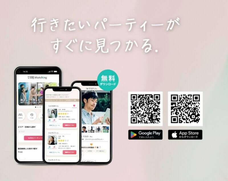 まずは「Google Play」または「App Store」でIBJ Matching公式アプリを無料ダウンロードします。