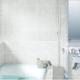 リクシル シャワーユニット の壁に埋め込まれた圧迫感のない照明で、縦に伸びる光が、空間に奥行きと広がりを与えます。