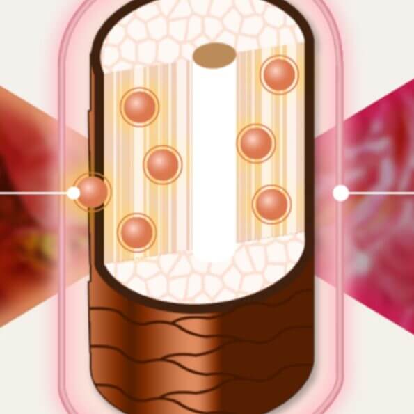 まず、エイジングケア成分で浸透性の高い「セラキュートV」により、髪の内部を補修。