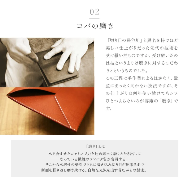 薄く縫い目のない財布を造り出すベタ貼りや、美しい仕上がりを実現するヘリの後切りなど、その高い技術は世界からも注目されています。