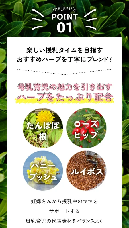meguru(めぐる)には、血流を促進するたんぽぽ根やローズヒップといった、母乳育児を応援するハーブがたくさん配合されています。