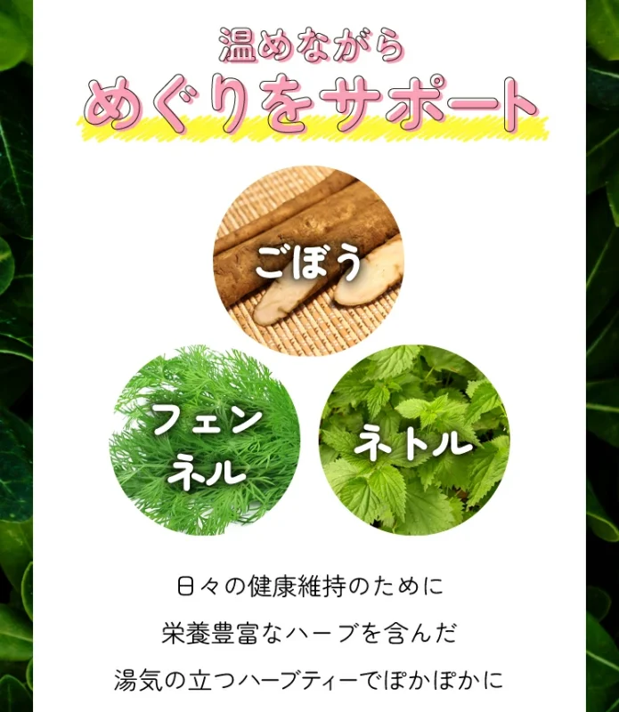 栄養豊かなハーブティーが、体をあたためてめぐりをサポートしてくれ、さらにほっとする香りのハーブはリラックス感も与えてくれます。