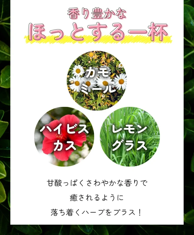 具体的にはカモミール、レモングラス、ハイビスカスが配合されていて、甘酸っぱさと爽やかさが特長。