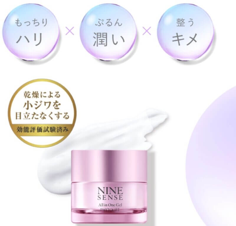 ナインセンスオールインワンジェルは非常にうるおい成分が多く、十分な保湿は乾燥小じわのケアにおすすめです。