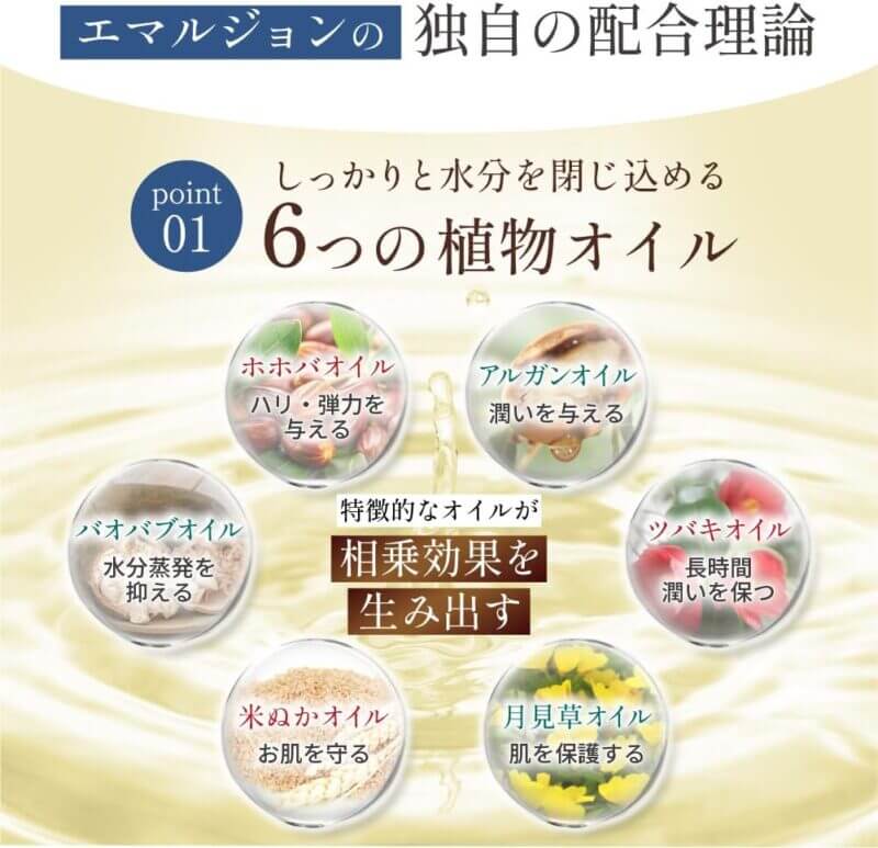 リニードル エマルジョンは、CICA(ツボクサエキス、マデカッソシド)や、ホホバオイル・アルガンオイル・ツバキ種子油など6種の植物由来オイルを配合。