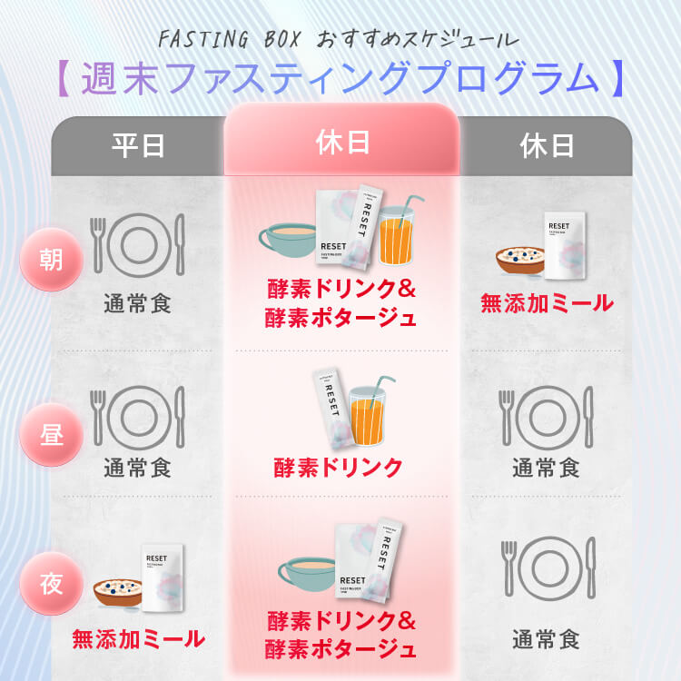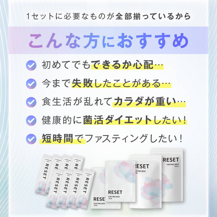 RESET BOXは短期間でスッキリ体を整えたい方、ファスティング初心者の方におすすめ。