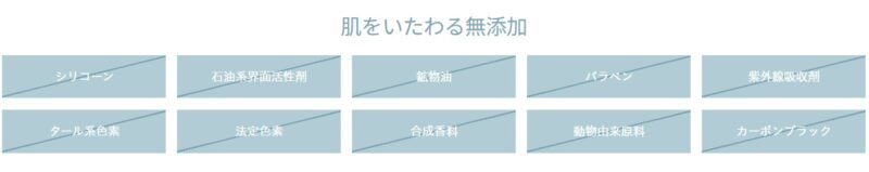 シリコーン、石油系界面活性剤、鉱物油、パラベン、紫外線吸収剤、タール系色素などの9つの成分を無添加です。