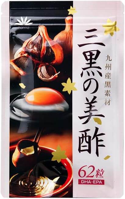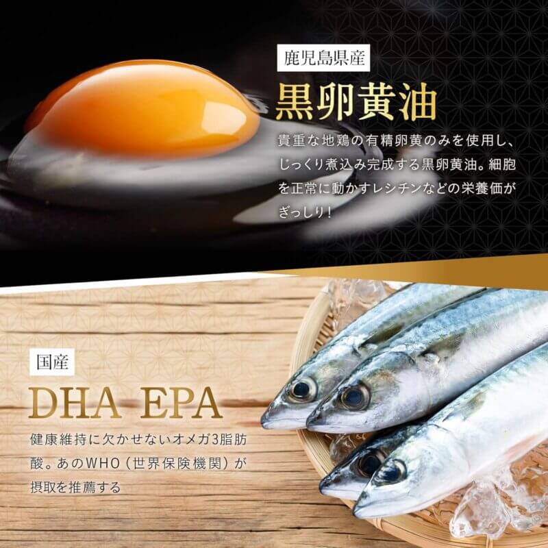 DHA・EPA含有魚油(国内製造)、黒酢もろみ末、発酵黒にんにく末、黒卵黄油、ゼラチン、グリセリン、ミツロウ、グリセリン脂肪酸エステル、ビタミンE、ビタミンB2、ビタミンB1、ビタミンB6