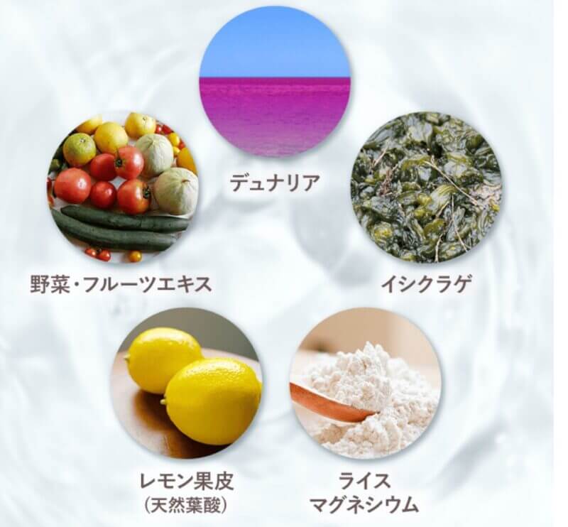 代表成分:デュナリエラ イシクラゲ 野菜・フルーツエキス レモン果皮(天然葉酸)ライスマグネシウム(リン酸マグネシウム)