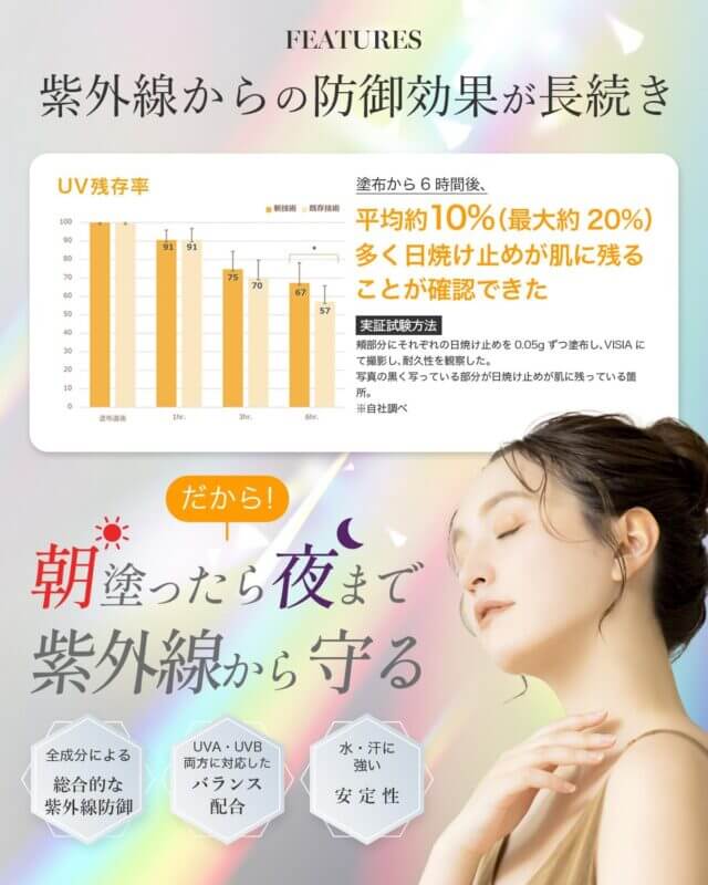 これにより、汗や水だけでなく摩擦に強く「朝塗って夜まで続く」を目指す処方を実現しています。