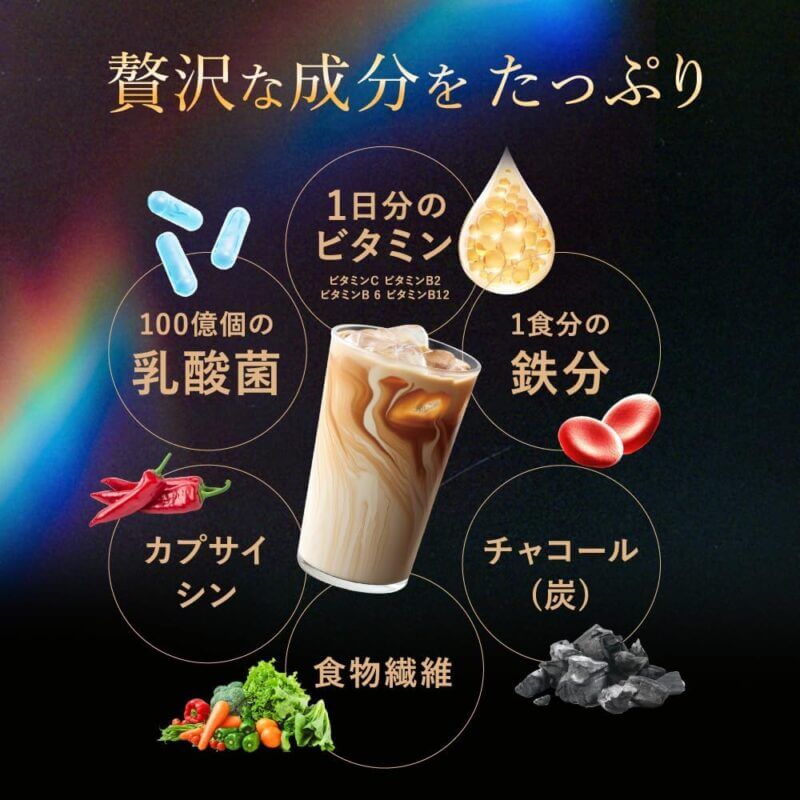 原材料:粉末状大豆たん白(国内製造)、ポリデキストロース(水溶性食物繊維)、脱脂粉乳(乳成分を含む)、コーヒーパウダー、葛の花抽出物、食塩、殺菌乳酸菌末/ビタミンC、増粘剤(キサンタンガム)、甘味料(ステビア、スクラロース)、乳化剤、ピロリン酸第二鉄、香料、ビタミンB₆、ビタミンB₁、ビタミンB₂、炭末色素、香辛料抽出物、ビタミンB₁₂